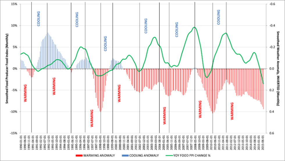 Vertikálne čiary oddeľujú obdobia otepľovania a ochladzovania, zelená línia zobrazuje zmeny cien potravín. Graf pomerne jednoznačne ukazuje, že ochladzovanie prináša rast cien potravín a otepľovanie naopak ich pokles.