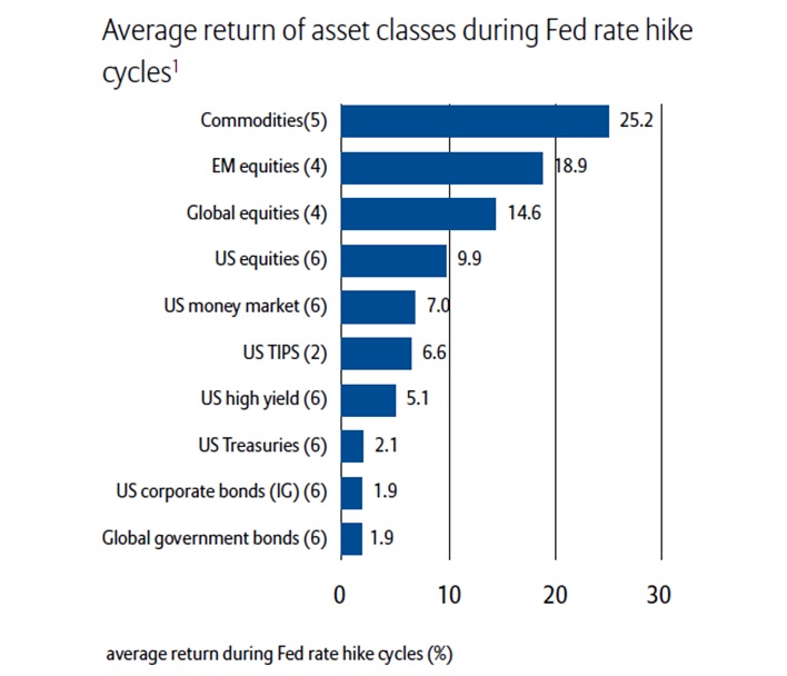 Ďalším zaujímavým faktom na margo Fedu a zvyšovania sadzieb je, že aktívami s najväčšími očakávanými výnosmi sú komodity a rozvíjajúce sa trhy!