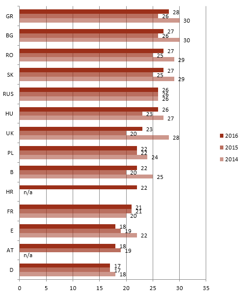 Ak porovnáme východ Európy so západom, horšie sú na tom východoeurópske krajiny: Platia načas len v 74 percentách (2015: 75 percent), západné o 6 percent viac (2015: 81 percent).